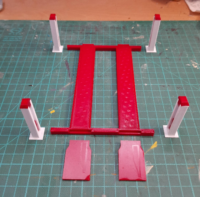 The display will be shipped partly un-assembled, please glue the platforms to the 4x posts as level as possible, with the run-on ramps. Cuboid buffers are included to raise the platform, these can be glued to the bottom internals of the posts if you wish.